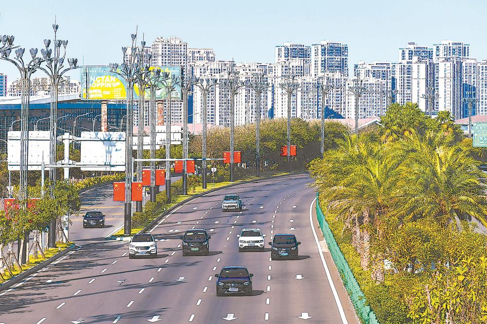 10月1日,平潭道路旁红旗招展,在棕榈树的映衬下,与城市建筑、往来车辆交织,满是蓬勃气象。(见习记者 刘宇捷 通讯员 江信恒 摄)
