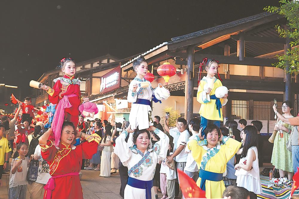 国庆中秋假期,厦门中山路将非遗民俗、光影艺术、多元演艺等元素深度融合,打造“日夜皆精彩、处处有亮点”的文旅盛宴。图为10月1日,玲玲马戏团舞者在厦门中山路进行互动表演。(记者 林梓健 通讯员 汪桓可 摄)