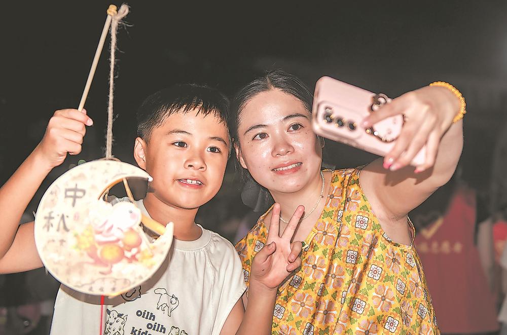 9月28日,泉州市“我们的节日·中秋”主题活动在永春县玉斗镇举行。广大群众在欢乐、喜庆的氛围里迎接国庆中秋佳节的到来。图为一对母子在体验亲子DIY灯笼后,开心地合影留念。康庆平 摄