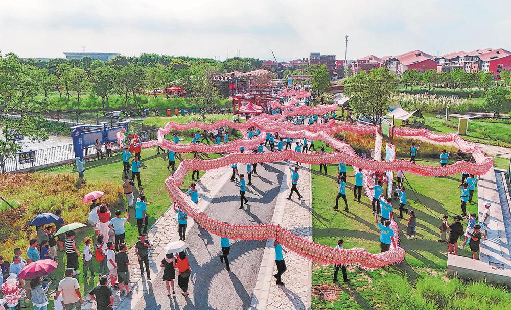1日至3日,晋江九十九溪田园风光文体旅嘉年华活动在晋江市池店镇田洋村举行。活动以九十九溪田园为舞台,通过田园徒步、非遗展演等,让市民游客感受田园魅力。图为活动期间举行的舞龙表演。(通讯员 董严军 摄)