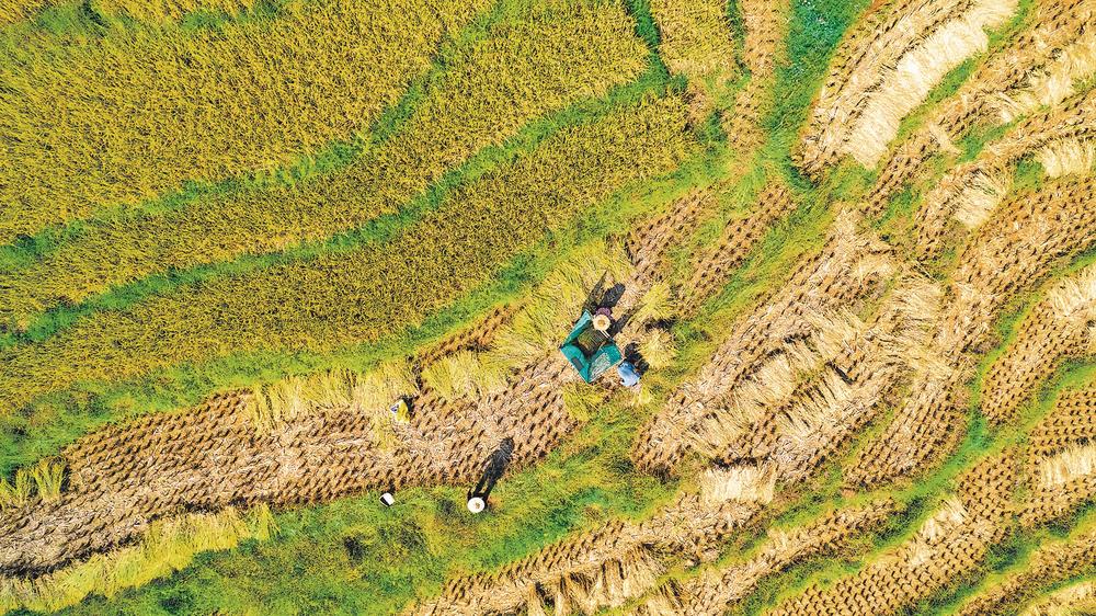 近日,德化县龙门滩镇霞碧村的梯田迎来水稻丰收季。村民们穿梭田间,割稻、打谷、装袋,忙碌身影中满是丰收喜悦。(许华森 林婉清 摄)