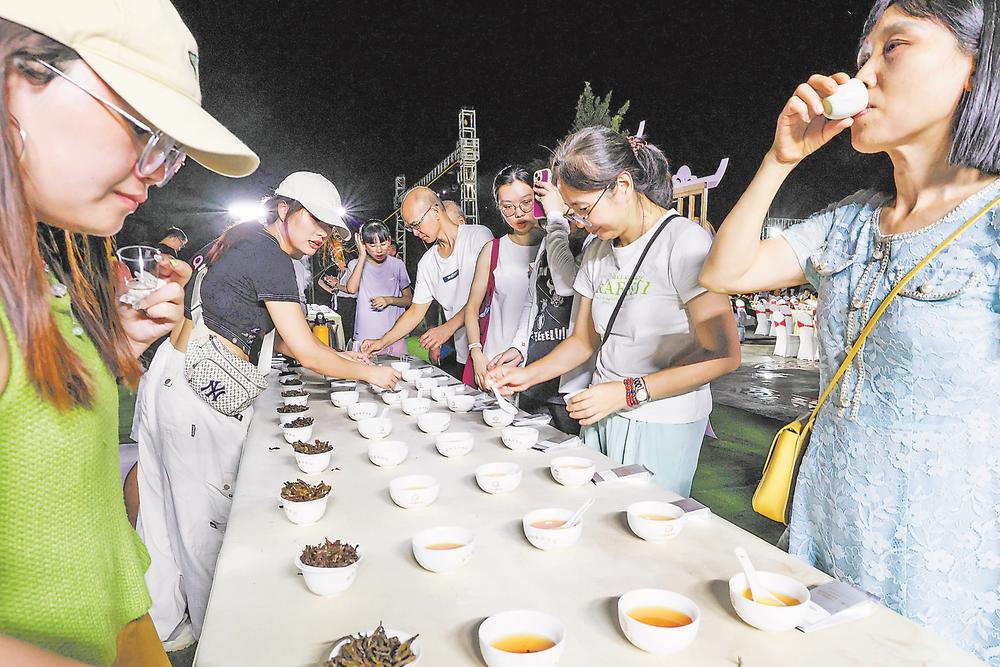 5日晚,茶友在武夷山市茶博园举行的千人品茗斗茶赛上品茶。茶博园广场上,近百张茶席错落分布,这场将持续7天的茶文化盛宴,让八方游客在山水间沉浸式感受武夷岩茶的独特魅力。(邱汝泉 摄)