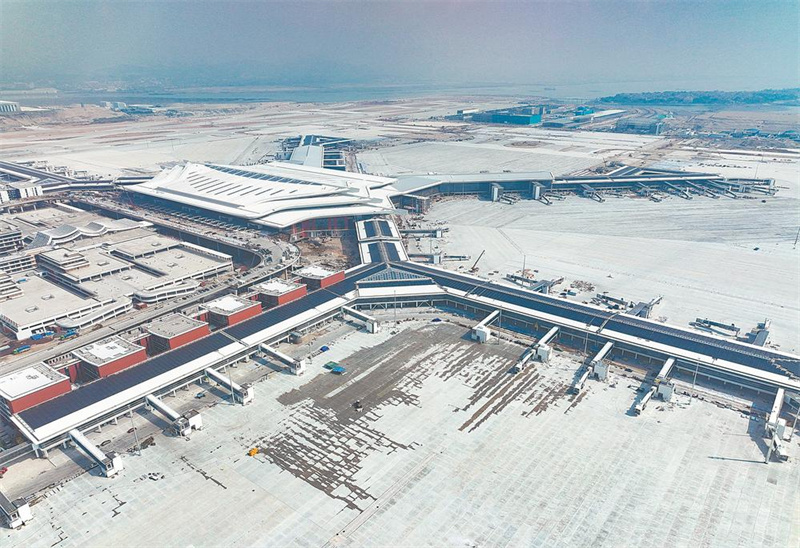 节日期间,厦门翔安国际机场上万名建设者坚守岗位。图为中建三局承建的机场航站区二标段项目施工现场正在进行并网调试的航站楼指廊屋面光伏发电系统。该系统已于9月底安装完成,整体装机容量达11.5兆瓦,年发电量约1300万千瓦时,可满足航站楼10%的用电需求。(报业集团记者 林梓健 通讯员 柯雅莉 摄)