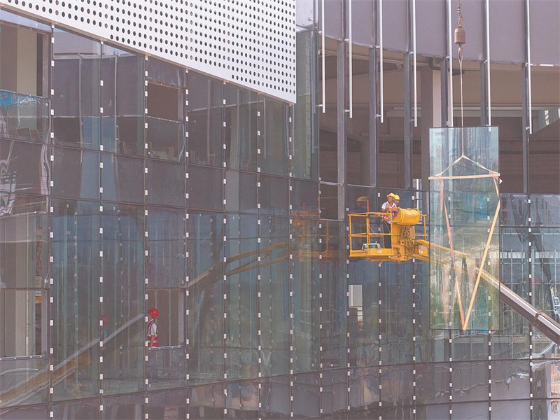 2日,晋江东石镇省集成电路产业园2号区块项目现场,施工人员在吊装玻璃幕墙。节日期间该建设项目不停工,600多名建设者在各个区域保障工程建设。该项目用地505亩,总建筑面积46.2万平方米,建成后将有力推进晋江集成电路产业集聚和全产业链生态圈成型成势。(记者 王毅 通讯员 林锦鑫 摄)