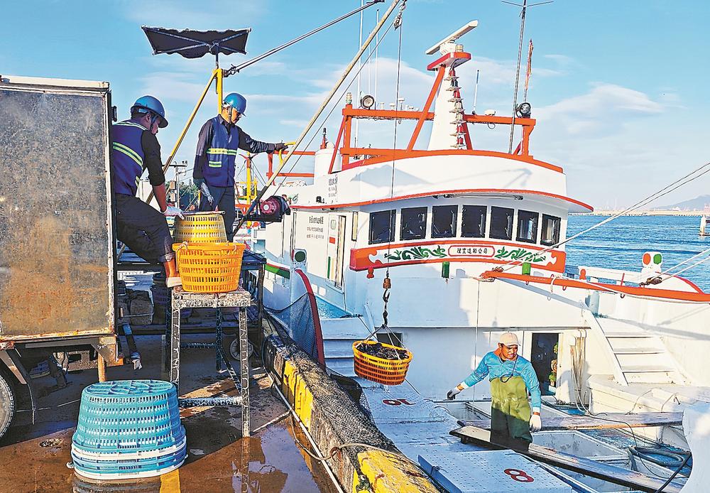 10月30日,两艘活鱼船“金海发26号”“昇裕昌”先后从台湾高雄驶入漳州东山港区,船上满载的40余吨活珍珠龙胆石斑鱼将在此完成转运。漳州边检站执勤一队提前部署,高效办理通关手续,确保这批鲜活水产“到港即作业、离港零延时”。今年以来,漳州边检站已保障两岸活鱼运输船舶近百艘次,助力超2000吨鲜活水产顺畅流通。图为船员和码头工作人员正在进行活鱼装卸。(记者 杜正蓝 通讯员 庄岩 摄影报道)