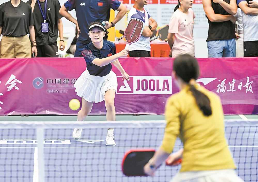 8日,为期两天的“建行·JOOLA杯”福建省全民健身运动会匹克球比赛在福州市海峡奥体中心网球馆开赛。比赛由福建日报社与福建省社会体育指导中心主办,福建日报新闻发展有限公司、福州市仓山区文化体育和旅游局等多家单位承办、运营推广及支持,吸引了全省16支代表队近160人参赛。这也是福建首次举办省级层面的匹克球赛事。图为比赛瞬间。(记者 游庆辉 摄)
