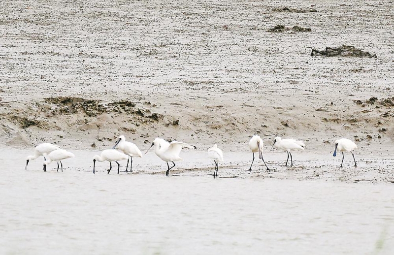 国家一级保护野生动物黑脸琵鹭在泉州泉港栖息