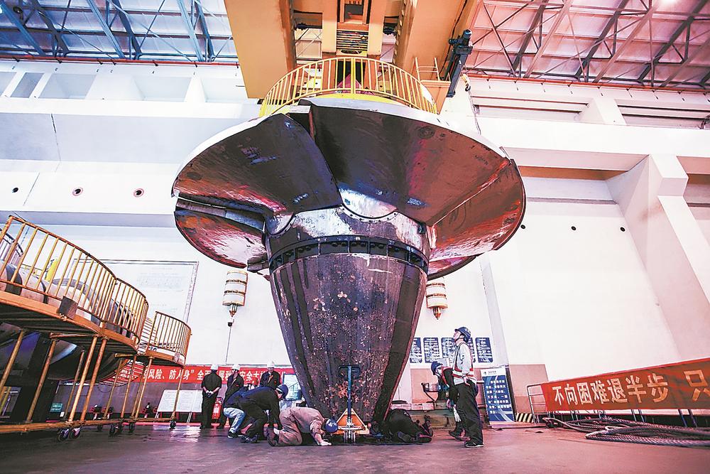 图为11月30日,检修人员将机组转轮吊装至安装间。(周义 摄影报道)