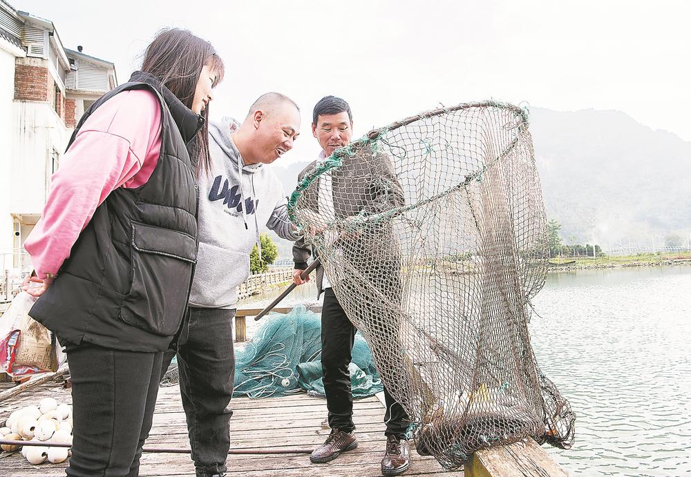 12月3日,赤溪村村民(右一)在向游客展示他养殖的中华倒刺鲃。