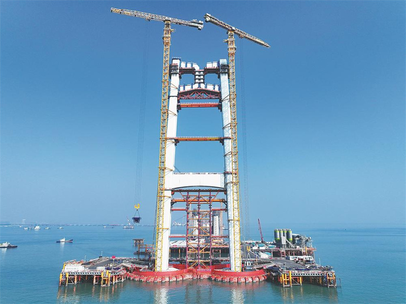 11日,厦金大桥刘五店航道桥东主塔横梁顺利合龙,标志着刘五店航道桥主塔工程全部完成。厦金大桥厦门段路线全长19.6公里,其中刘五店航道桥主跨928米、主塔高178.1米,是福建省内最大跨径桥梁,也是省内首座全离岸式海中悬索桥。大桥采用双塔双索面设计,两座主塔隔航道对称而立,以“門”字造型寓意“一桥连两门、两岸一家亲”。(林梓健 惠浩喆 摄)