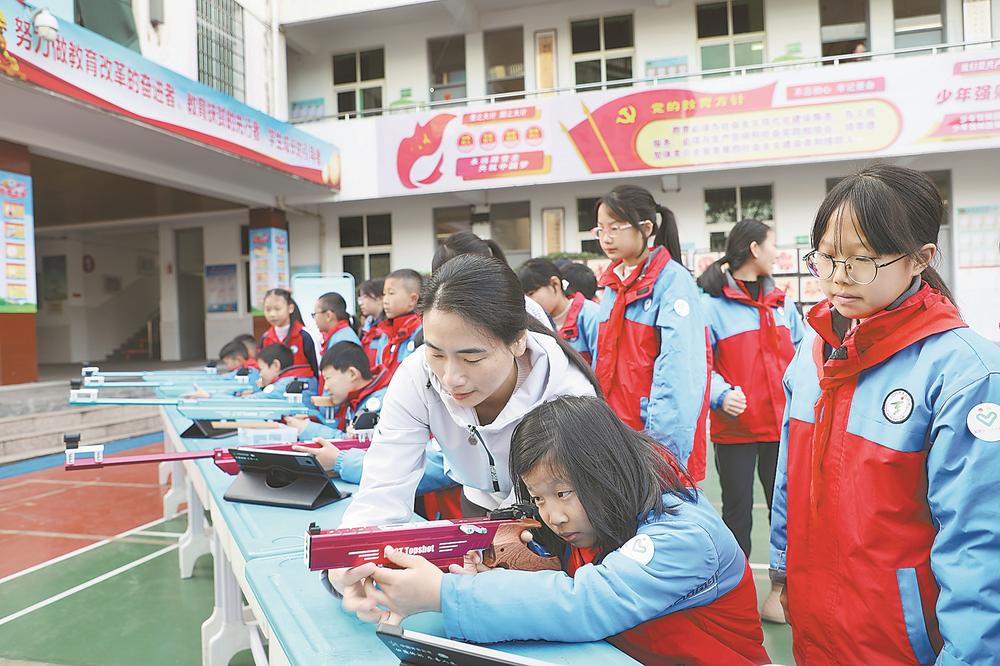 17日,“公益体彩 快乐操场”活动在宁化县东风小学举行。射击世界冠军、全运会冠军李雪艳分享了自己逐梦赛场的成长故事,并现场指导学生光电射击,点燃他们的运动热情。图为李雪艳在现场作指导。(通讯员 赖全平 张雪丹 摄影报道)