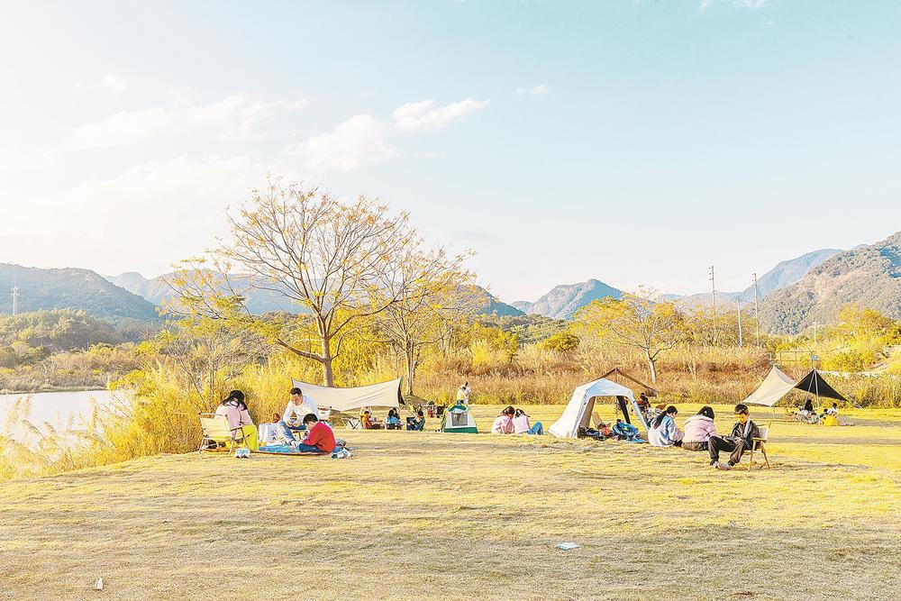 近日,连江县贵安溪边,市民游客纷至沓来,搭起帐篷,体验自然野趣。在这里,蓝天为幕,草地为席,亲子互动、好友欢聚,静享冬日暖阳。(通讯员 丁天霖 摄)