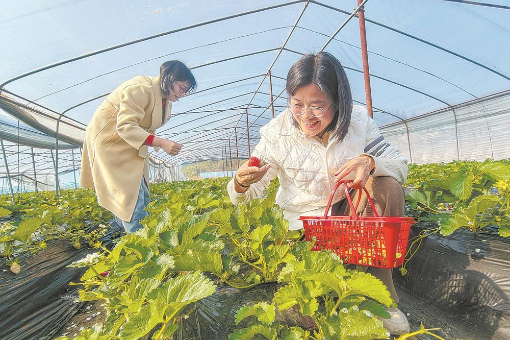 近日,顺昌县元坑镇的草莓种植大棚里,游客正在采摘成熟的草莓。