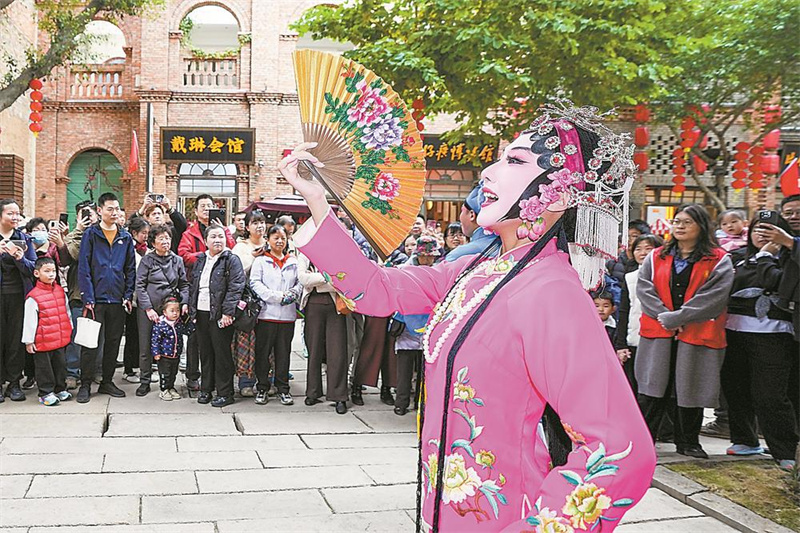 1日,在福州市上下杭历史文化街区,非遗闽剧、曲艺演奏、簪花打卡等特色项目精彩纷呈,吸引游客沉浸式感受古今交融的千年闽都韵味,尽享新年美好假期时光。图为闽剧演员的戏曲表演快闪活动吸引众多游客。(通讯员 谢贵明 摄影报道)