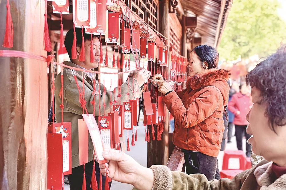29日,龙岩市长汀县宣成乡举办“传承红色基因 喜迎丙午新春”暨“我请乡亲赶年集”春节活动。现场,上千名乡亲欢聚一堂,感受浓浓年味与温暖民情。图为乡亲悬挂祈福牌,寄托新春祝福。王志豪 陈炳林 摄