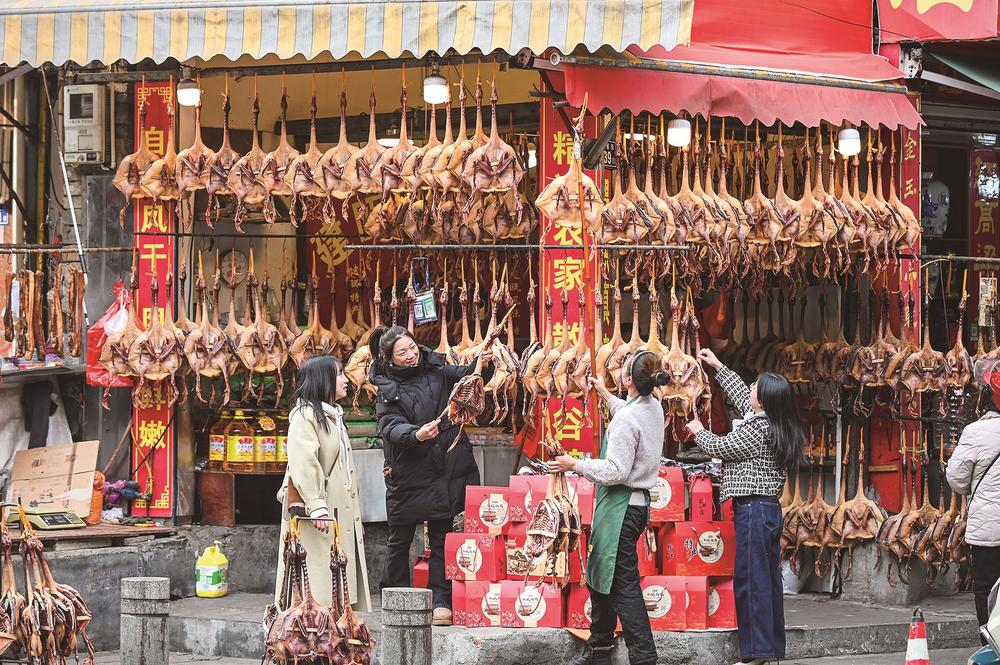 2月9日,建瓯市管葡路上一家板鸭店内,顾客络绎不绝,生意格外红火。建瓯板鸭制作技艺是南平市级非物质文化遗产。作为我省传统名优土特产之一,建瓯板鸭素有“八闽佳肴”美誉,深受广大消费者青睐。获授权使用“建字号”品牌后,建瓯板鸭如虎添翼,年销量突破300万只,成为当地一张亮眼的名片,是年夜饭桌上的经典菜品。(魏永青 罗光耀 摄影报道)