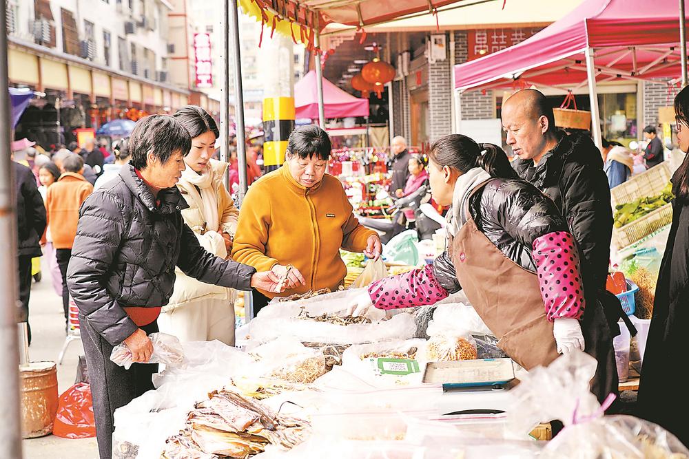 农历尾数为“三、八”的日子是龙岩市永定区下洋镇的圩日。2月10日是农历十二月廿三,又临近春节,下洋镇迎来年圩盛会。街道两旁搭起一排排简易商铺,赶圩的人群摩肩接踵,春联福字、瓜果蔬菜、手工糍粑、牛肉丸以及糖果、玩具等各色年货琳琅满目,洋溢着浓浓的年味。(黄秋萍 范浩东 摄影报道)