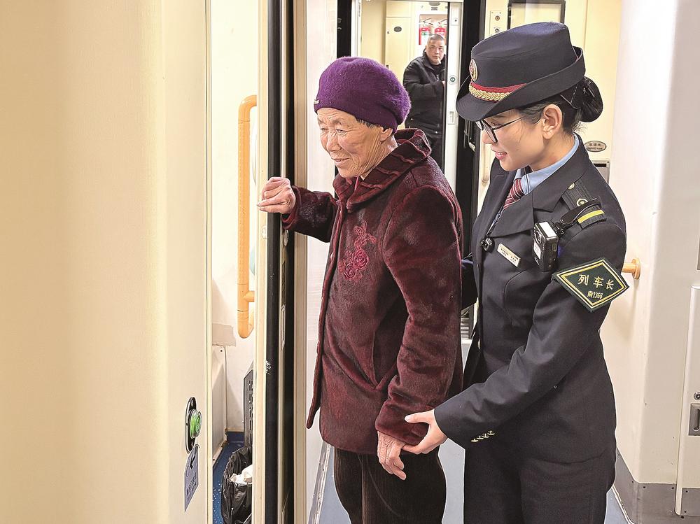 近日,在厦门北开往兰州的列车上,列车长扶老年旅客去洗手间。春运期间,福州客运段厦渝车队推出一系列“银发服务”专项举措,用精细化、有温度的服务,护航老年旅客平安温馨出行。(通讯员 邱鹏原 摄)