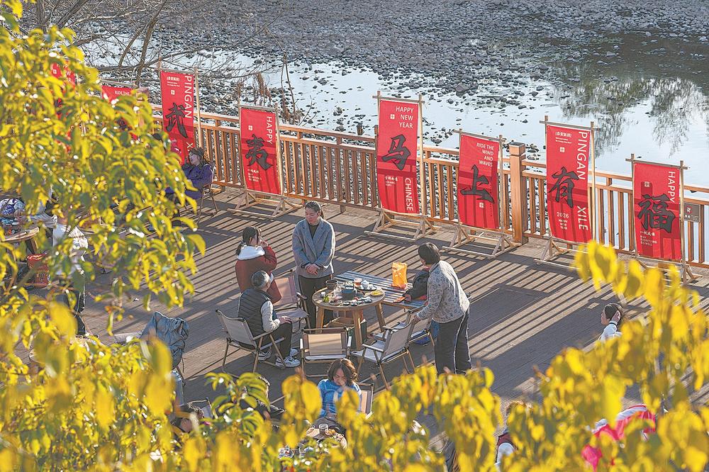 正月初四,武夷山市崇阳溪漫步道围炉煮茶体验人气正旺,市民游客在茶香与暖阳中尽享慢时光。(陈天博 摄)