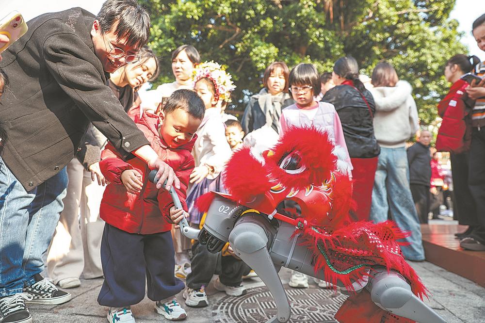 2月21日,机器狗亮相漳州古城,与八方游客零距离互动,大人小孩开心不已。(郑文典 摄)