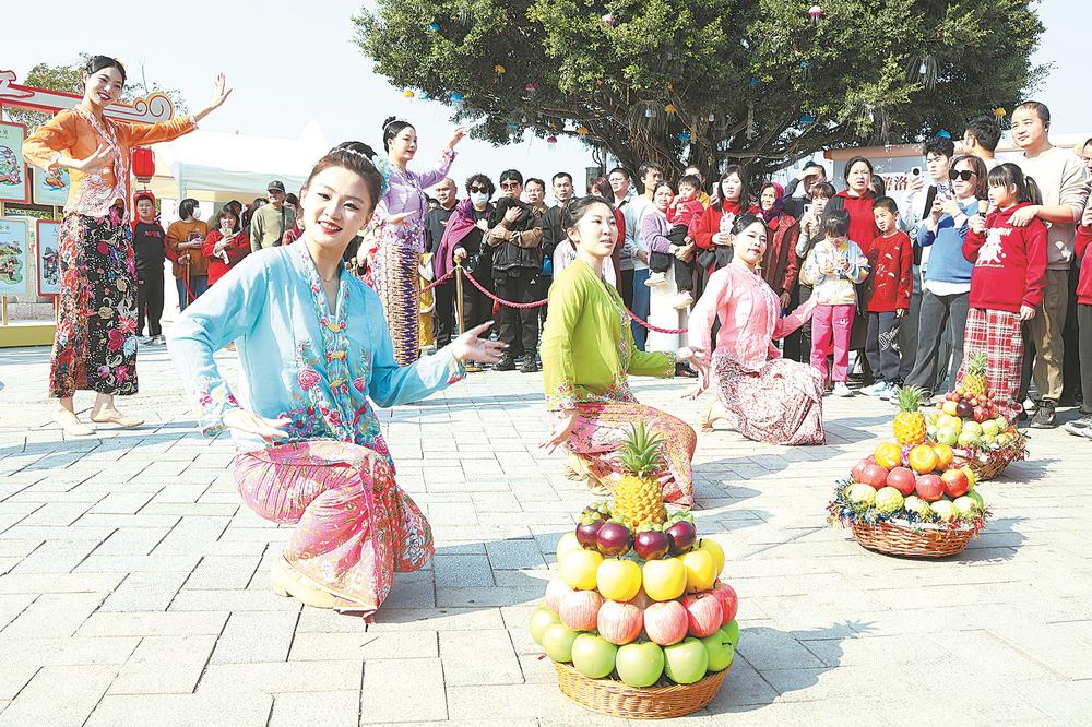 2月19日,“世遗桥畔·烟火洛江”2026桥南古街新春文旅嘉年华在泉州洛阳桥畔举行。身穿印尼服饰的舞者起舞,将现场气氛点燃。(赖淑玲 摄)