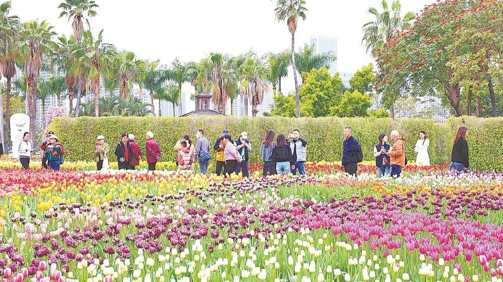 2月18日,游客们在厦门园博苑欣赏郁金香花展。春节期间,13.6万株郁金香绽放,为春节的厦门带来勃勃生机。(李娴凤 摄)