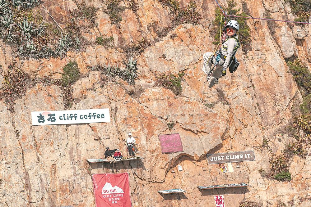 2月18日,连江黄岐半岛的古石村,许多自驾前来的游客在此体验独特的山海之美,并参与攀岩喝咖啡及海上滑索等户外运动,感受不一样的假期休闲游。(王毅 摄)