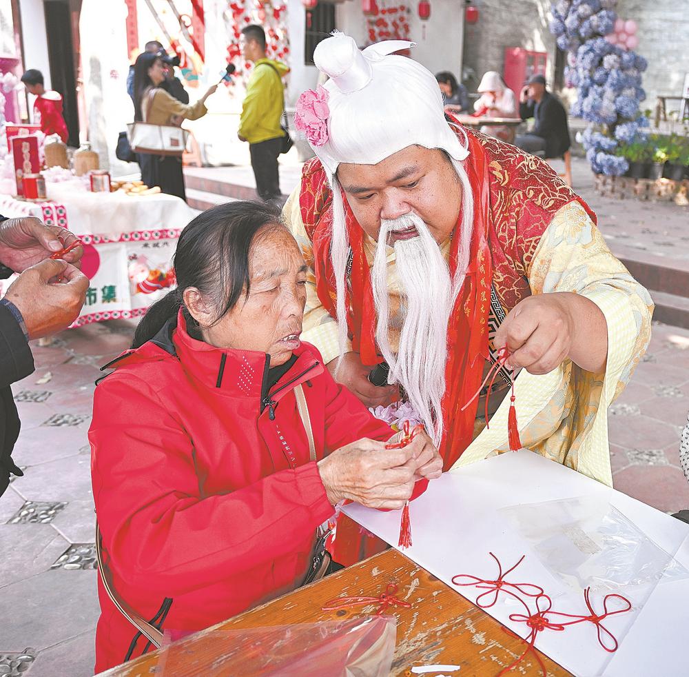 2月22日,厦门市集美区城内社,“马到厝边·趣祈福”新春年俗活动热闹上演,村民、台胞与游客欢聚在一起,沉浸式体验闽南年味,共赴两岸同欢的新春之约。图为身着月老形象服装的台青现场指导游客制作中国结。(林志杰 摄)