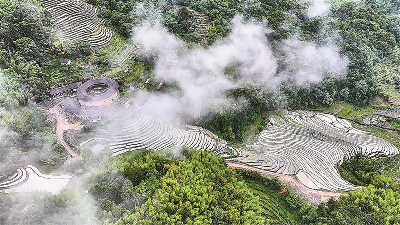 春日,永定区横甲土楼同蓝天、梯田相映成趣。近年来,当地推动空气、水环境质量逐年提升,实现“蓝天、碧水、净土”。(通讯员 熊川 摄)