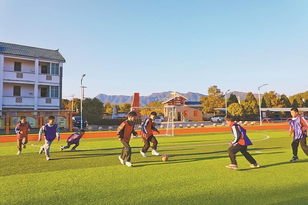 2018年,学校筹资180多万元,将昔日的荒草地建成标准化足球场,并配齐足球、标志桶、训练背心、敏捷梯、体能训练器械等装备,点燃孩子们的足球梦。与此同时,学校积极开展“校园足球文化”系列活动,通过“玩足球、画足球、讲足球、赛足球”等形式,不断丰富校园足球文化,让学生爱上足球。