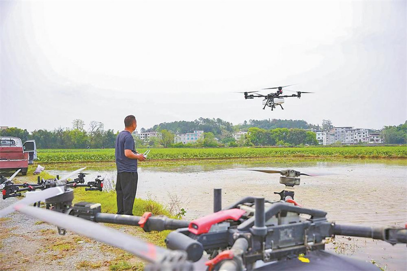 在河田镇南塘村田间,记者看到,一架载满稻种的无人机腾空而起,沿着规划航线匀速飞行。舱门打开,饱满的稻种如细雨般均匀撒落,沉入水田,一个小时便能完成50亩的播种作业,相较于传统人工撒种效率提升了近10倍。