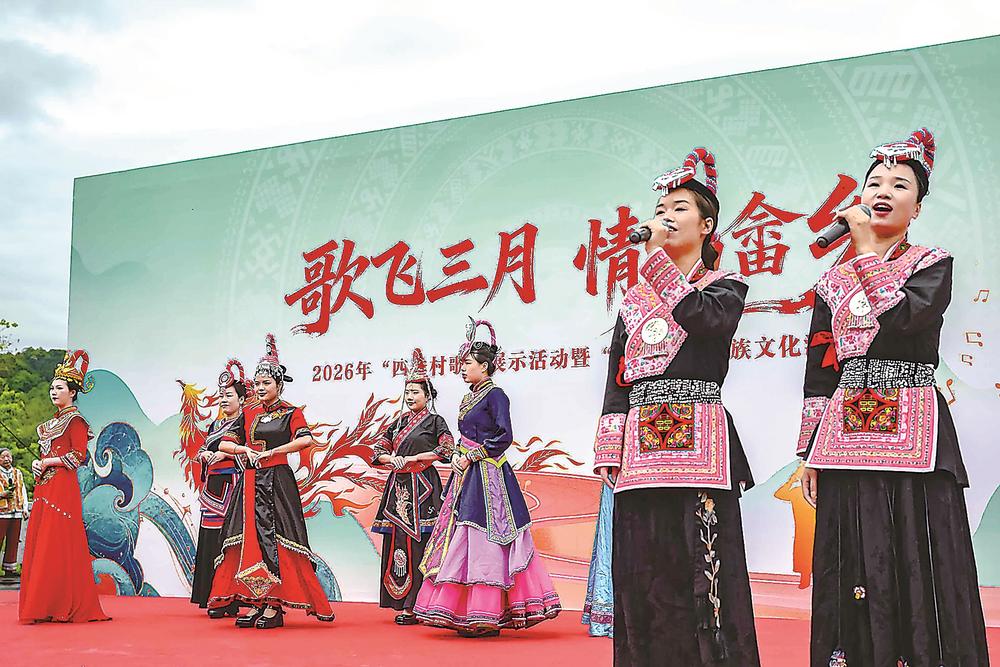 23日,福州市晋安区唯一的畲族聚居乡——日溪乡举办“三月三”畲族文化活动。现场,“山歌对对碰”展示了畲族山歌从古老传承到当代创新的动人图景,还有抛茶青、赶野猪、板鞋竞走等畲族传统特色竞技项目,吸引了众多游客参与。(通讯员 陈暖 记者 陈欢欢 摄)