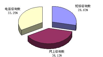 全省共有231343人次通过各种方式咨询与政府信息公开有关事务,其中现场咨询数66236人次,占28.63%;网上咨询数88187人次,占38.12%;电话咨询数76920人次,占33.25%.如图所示: