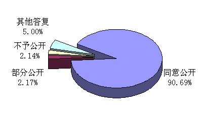 全省受理依申请公开政府信息5381件,已经依法答复5380件,正在办理1件。其中,“同意公开”的4879件,占90.69%:“同意部分公开”的117件,占2.17%:“不予公开”的115件,占2.14%;以“不属于政府信息”、“政府信息不存在”、“非本部门掌握政府信息”等其他形式答复的269件,占5%.如图所示: