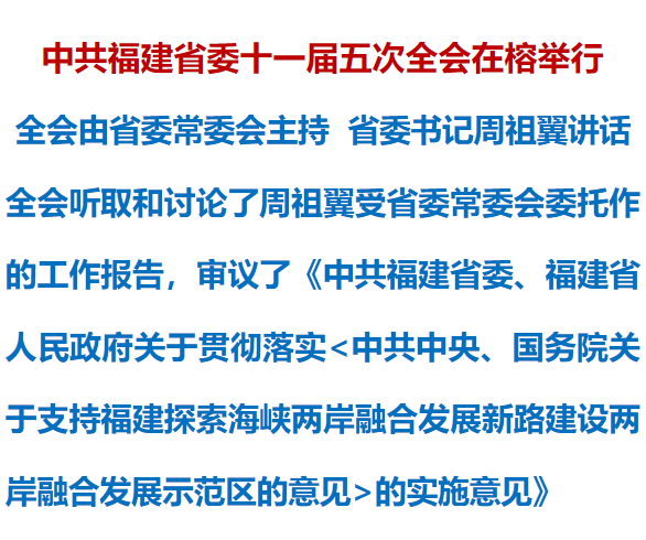全会听取和讨论了周祖翼受省委常委会委托作的工作报告,审议了《中共福建省委、福建省人民政府关于贯彻落实〈中共中央、国务院关于支持福建探索海峡两岸融合发展新路建设两岸融合发展示范区的意见〉的实施意见》。周祖翼就《实施意见(讨论稿)》向全会作了说明。
