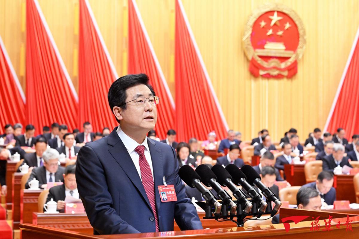 省长赵龙代表省人民政府向大会作政府工作报告。报告分为三个部分:一、坚持以习近平新时代中国特色社会主义思想为指导,新福建建设取得新进展新成效;二、坚持以推动高质量发展为主题,全力以赴做好2024年各项工作;三、坚持和加强党的全面领导,努力打造让人民满意的服务型政府。