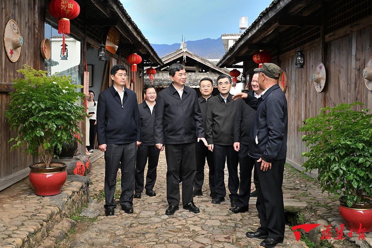 红土地孕育了厚重的红色文化。位于长汀和连城交界处的松毛岭重峦叠嶂、地势险要,90年前的松毛岭之战为中央红军主力长征赢得了宝贵时间。周祖翼一行冒着细雨拾级而上,在松毛岭战斗烈士纪念碑前整齐肃立,敬献花篮。周祖翼走上前整理花篮上的缎带,带领大家向烈士纪念碑三鞠躬,并缓步绕行纪念碑一周,向革命先辈致以深切的崇敬与缅怀。松毛岭下的中复村有“红军长征第一村”之称。周祖翼沿着古街察看了村里的红军桥、红军街和松毛岭战役指挥部旧址、红九军团陈列馆等,关注长征国家文化公园项目建设情况,共同重温那段艰苦卓绝的革命历程,感受军民团结一心的鱼水深情。在连城县庙前镇庙上村,周祖翼走进中央苏区医史馆——采陔公祠、江一真陈列馆,详细询问了解红色文化资源挖掘阐释、传统村落保护利用、文旅项目开发等工作,叮嘱当地要赓续红色血脉,传承良好家风、培育文明乡风,展现美丽乡村新气象。在连城县朋口镇文坊村,周祖翼参观了项南同志生平事迹展陈,认真听取工作人员讲解,通过珍贵的历史照片、文献和展品,感悟项南同志的“长者风范、公仆榜样”。周祖翼说,我们要弘扬党的光荣传统和优良作风,牢记初心使命,坚定理想信念,践行党的宗旨,为实现人民对美好生活的向往不懈努力。