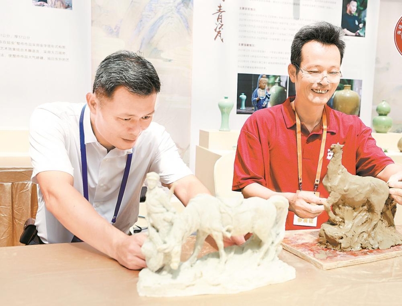高级工艺美术师陈春晖(右)和陈春阳(左)现场创作泥塑。
