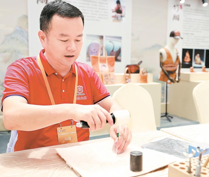 兆丰皮业公司负责人陈志鸿现场创作皮雕。