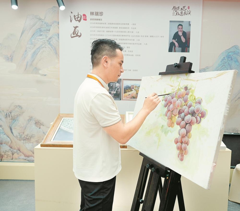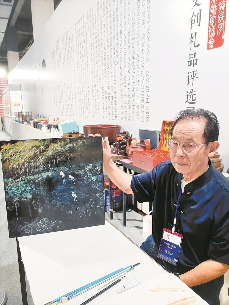 在漆器展示区,记者看到高级工艺美术师林光旭为观众现场创作,他手法老到,一会儿用画笔在板上勾勒描摹,一会儿直接上手,将绘画材料沾到手上,然后在画上添添补补,不多久,一幅栩栩如生的生态田园画便映入眼帘……