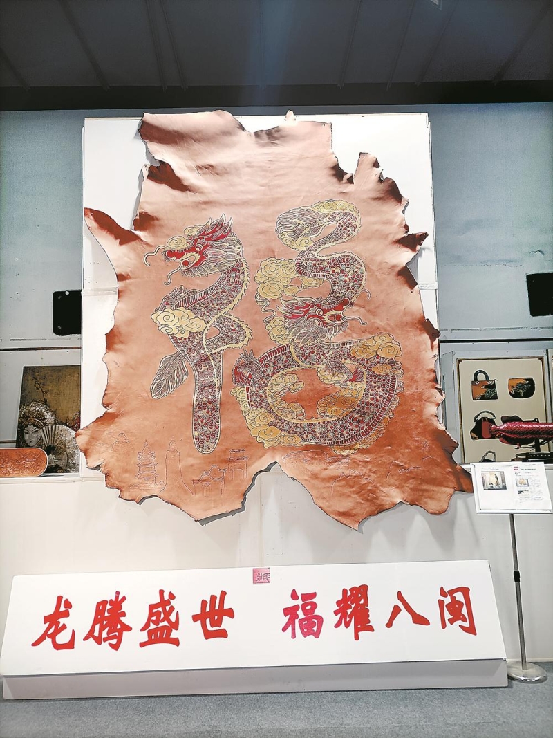 在兆丰皮雕展示区,一幅硕大的皮雕作品悬挂于墙上,引来与会者驻足观赏。“这件巨作高3米、宽2.3米,利用牛皮结实、耐用、易刻等特性,经过设计、雕刻、上彩等几十道工艺,历时3个月完成。”主创人陈志鸿介绍说,采用传统文化中的福、龙、云等元素进行创作,以双龙腾舞和祥云瑞气构成“福”字图案,在金黄色的“福”字之下,刻有武夷山、湄洲妈祖、厦门日光岩等八闽图景,寓意国泰民安、百姓得福。