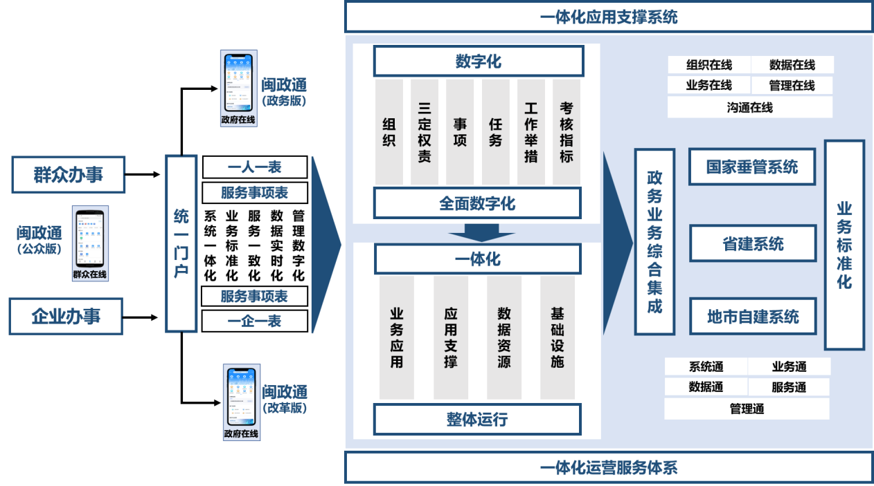 围绕“对内好办公”,建设省级一体化协同办公平台、闽政通(政务版)APP,以统一服务入口、统一身份认证、统一办公门户、统一沟通协作为基础支撑,建立数字化决策机制体系,推进机关内部整体协同、高效运行、科学决策。