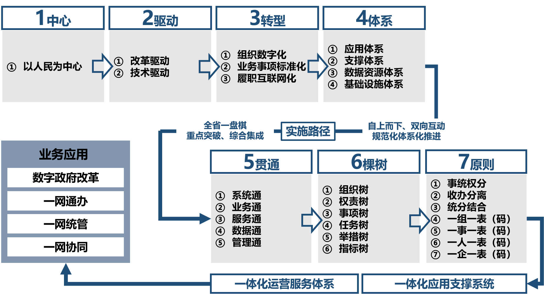 5个贯通——系统通、业务通、数据通、服务通、管理通。基于一体化基础设施体系,实现各层级系统纵向互联互通、各协同系统横向互联互通、新旧系统互联互通、端到端互联互通,全面实现系统通。基于业务标准化协同化转型,实现业务事项标准化,推动工作任务通、业务事项通、指标体系通、工作信息通,事项、任务、指标、信息相互关联、环环相扣,全面实现业务通。通过数据实时化、任务数据通、业务数据通、服务数据通、基础数据通,打破数据壁垒,全面实现数据通。在系统通、业务通、数据通的基础上,打造服务一致化、前台受理通、后台办理通、服务流程通、问题反馈通的全业务闭环服务通。基于政府履职智能化转型的成果,实现互联网管理数字化、任务管理数字化、业务管理数字化、服务管理数字化、监督考核数字化的全方位管理通。