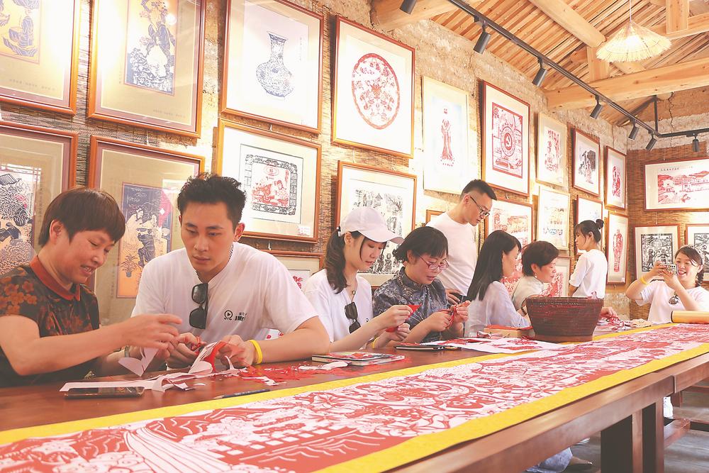 游客在柘荣县城郊乡靴岭尾村学习剪纸。柘荣县摄影协会供图