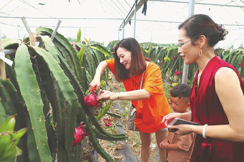游客来到山城周宁体验火龙果采摘。汤文娟 摄