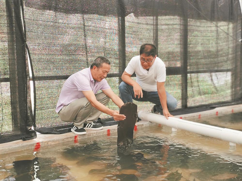 金振辉(左)和逄少军在育苗室观察种海带生长情况。受访单位供图