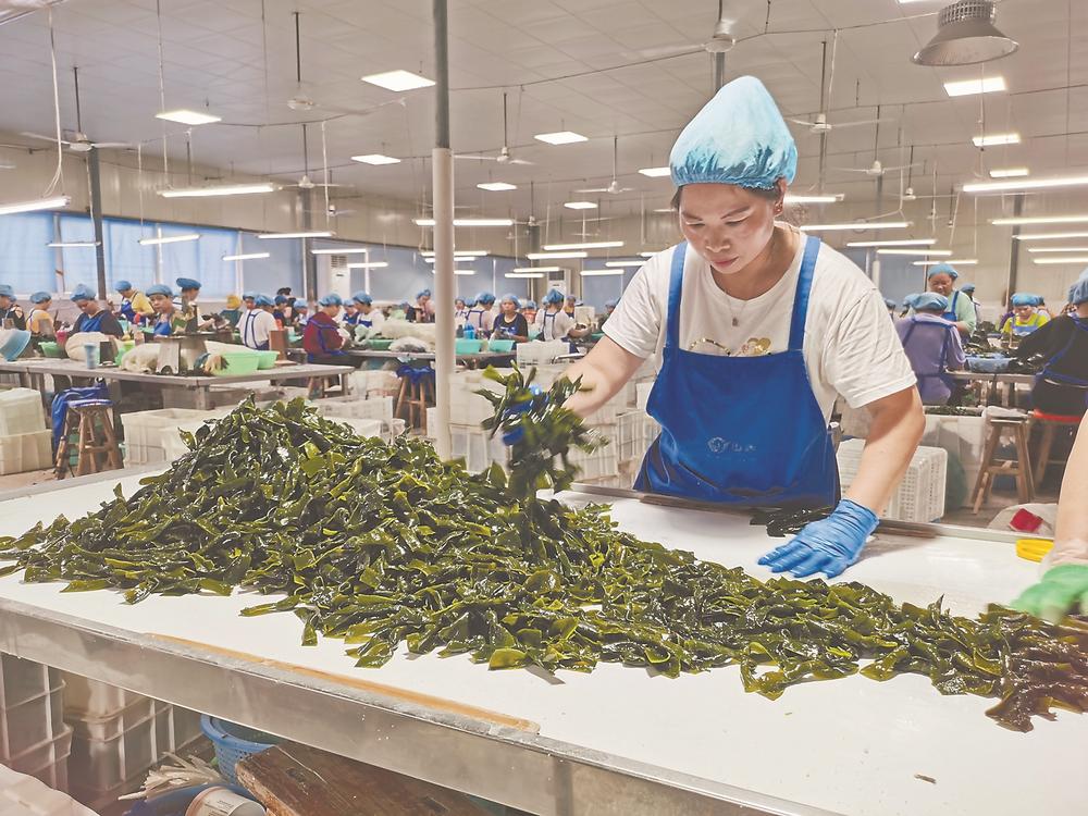 产业园内的全新现代化海带智慧加工厂于去年5月投用,具备年产10万吨即食海带的能力。在窗明几净的车间,从海带清洗到混料加工、装袋包装,只见机器流水作业,几乎不见工人。