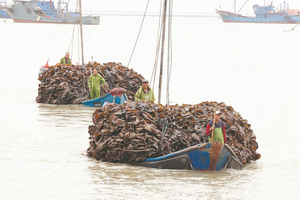 在福州市连江县定海湾海洋牧场海带养殖区,渔民驾驶着满载海带的舢板驶向码头。通讯员 王旺旺 摄