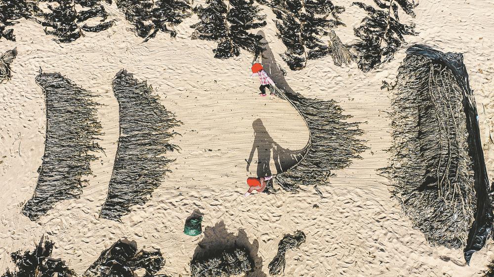 5月,宁德霞浦长春镇,海上“夏收”进入旺季。晴好天气,一艘艘满载海带的渔船、舢板回港卸货。滩涂上竹竿林立,挂晒的海带在黄绿大地上留下斑驳的影子;海带加工场里,机器不停歇,清洗、烫煮、盐渍、入库。小镇的空气中弥漫着浓浓的咸湿味。