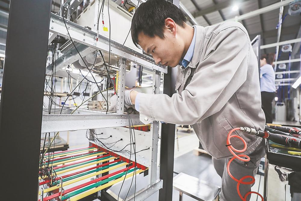 科华新建项目车间工人在装配336V交流屏主机。
